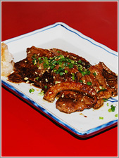 五十嵐 店は、いつ頃からやってるんですか。 多賀 なんでも明治時代から谷中に店を構えていたとか…。歴史の古い店なので、その意味では近代化されていないお蕎麦の味が楽しめます。それに店主が凝っていて、近所にある酒の卸問屋から旨い酒を仕入れて出してくれるんですよ。 蕎麦は栃木産の蕎麦粉を使った手打ちの極細で、ほどよいコシと喉ごしの良さが自慢である。また、多賀氏の言うように、「川むら」は日本酒の品揃えが豊富だ。「喜楽長」など他店ではなかなか味わえない酒もある。魚の刺身をはじめ酒肴の品揃えも多く、日本酒党にはたまらない店であろう。 五十嵐、多賀ご両人は、つまみに「鴨たたき」「米なすあげ」「そばのかいわれ」 |