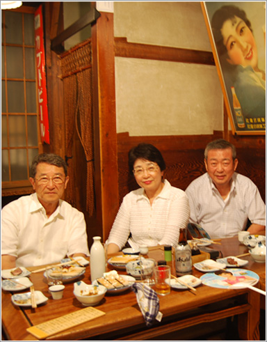 当初、言問通りに面して店を構えていた鍵屋は、道路拡張のために、大正元年に建てられた現在の建物に越してきた。元の建物は取り壊されることなく、東京・武蔵小金井の「江戸東京たてもの園」に移築されている。 暖簾をくぐると、オレンジ色の裸電球が灯る飴色の空間に迎えられた。店主の案内で小上がりに座る。店の壁には、着物姿の女性が微笑むカブトビールの美人画ポスターなどが飾られている。かなりの年代物であろう。 鍵屋に置いてある日本酒は、「大関」「菊正宗」「桜正宗」の3種類。五十嵐氏、多賀氏ご夫妻は菊正宗を注文する。つまみには「冷奴」「味噌おでん」、「合鴨塩焼き」などの焼き鳥、そして店自慢の「うなぎのくりから焼き」を頼んだ。「うなぎのくりから焼き」は、縦に裂いたうなぎを串に巻きつけるようにして刺したもの。これにタレをつけ、炭火で焼いた逸品だ。鍵屋に来たらぜひ食べてみてほしい。 |