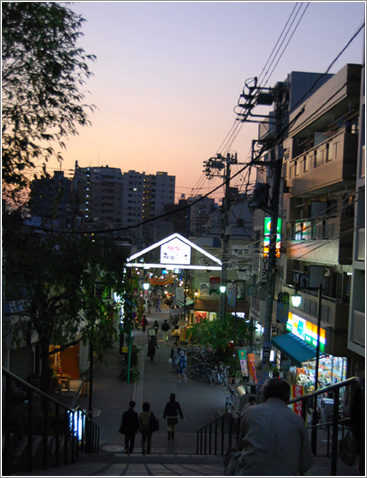 店を出て、坂道を下る。次に目指すは日暮里の隣り駅・鶯谷に近い「鍵屋」という居酒屋。電車を使えば数分の距離だが、まだ陽も高い。そこで、「谷根千」をのんびり歩くことにした。「川むら」の前の坂道を下ると、視界が開け、眼下に石段が見えてくる。