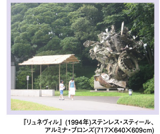 この美術館に訪れた多くの来館者は、まず、玄関脇に設置された、一見廃材の寄せ集めにしか思えないような、人間の背丈の4倍以上ある巨大な「作品」に度肝を抜かれます。はやくも難解な「現代美術」に白旗を揚げてしまいそうだが、そもそもこの「困惑」こそが「作品を感じている」こと。安心してください、あなたは「アートがわからない人」ではありません。そうです、この際、背後に広がる庭園の牧歌的な風景と対極にあるような、退廃的なスティールのかたまりがもたらす不思議空間を、大いに愉しみましょう。 |