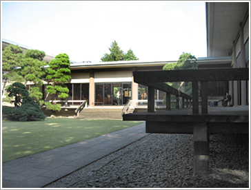 建物は、『源氏』『紫式部』の展示にふさわしい平安時代の寝殿造となっている。設計は、純和風建築をモダンにアレンジすることに才能を発揮した吉田五十八(よしだ・いそや)。奈良の大和文華館も同氏による設計で、両館の建物は兄弟関係にあり、収蔵品のつながりも深い。 |