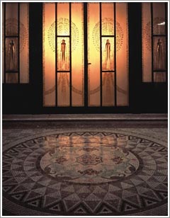 幾何学的な花のモチーフがアルー・デコ様式の特徴を示す。上部は、レイモン・シューブによる鉄製の飾り細工。光の具合で豊かに表情を変えるガラス扉は、いまもなお「モダン」な印象を与える。アングランは、教会建築に数多く作品を残した当時フランスで人気の工芸家。 |