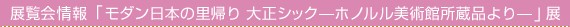 2007年4月14日(土)から7月1日(日)まで「モダン日本の里帰り 大正シック―ホノルル美術館所蔵品より―」展を開催。ホノルル美術館の日本美術コレクションから同館の学芸員が選定した、大正時代から昭和戦前期の西洋モダニズムやアール・デコの影響を受けた日本画、ユニークなデザインの着物や工芸品など、約80点を展示する。2002年にホノルルで開催された後、アメリカ国内を巡回し好評を博した本展では、私たち日本人がこれまで気づかなかった日本美術の魅力を発見できる。 |